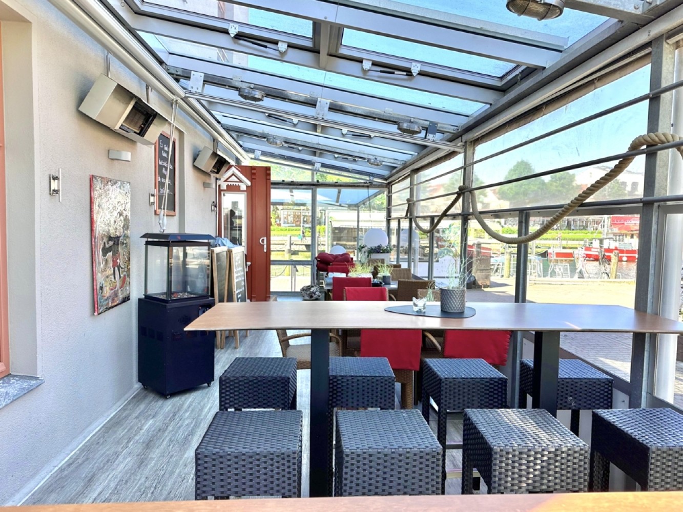 Ergänzend wurde bei der Stadt eine zusätzliche Außenfläche von ca. 83 m² angemietet. Darauf befindet sich der Terrassenbereich, welcher als Wintergarten dient und ans Restaurant anschließt.