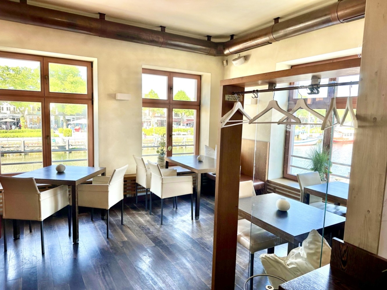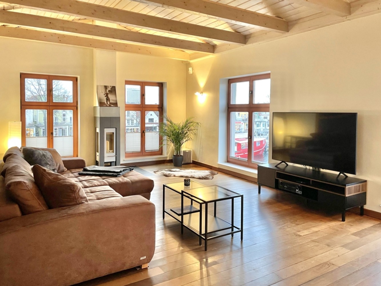 Die Einheit verfügt über ein helles Schlafzimmer, ein modernes Badezimmer sowie einen großzügigen Wohn- und Essbereich mit Ausblick auf den Alten Strom sowie die umliegenden Geschäfte und gastronomischen Angebote von Warnemünde.