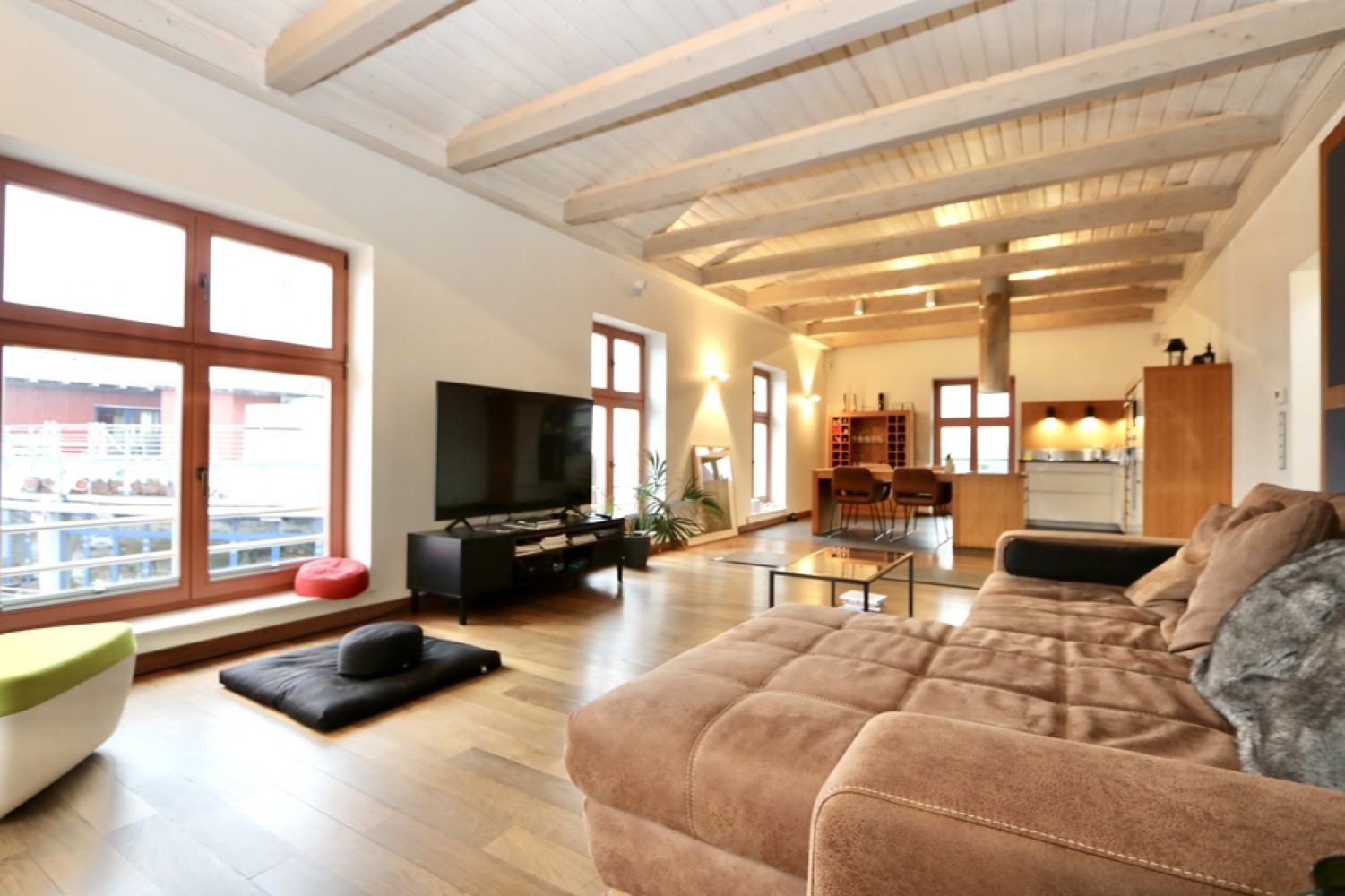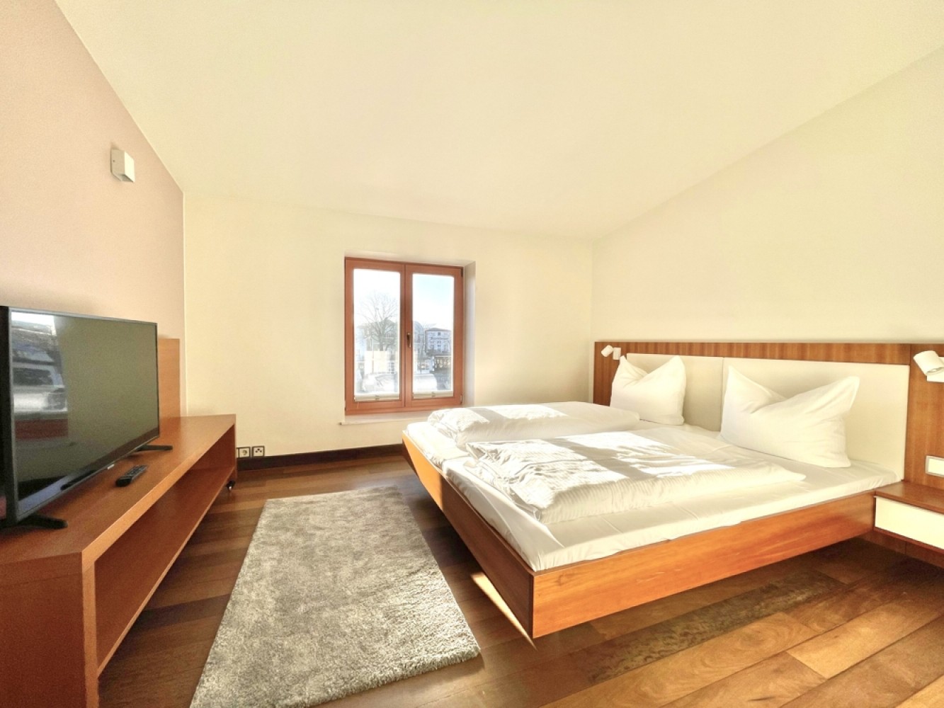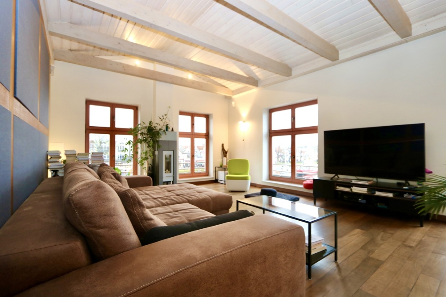 Die Fenster verfügen über eine wirkungsvolle Schalldämmung, sodass weder Geräusche aus der darunterliegenden Gaststätte noch von außen wahrnehmbar sind.