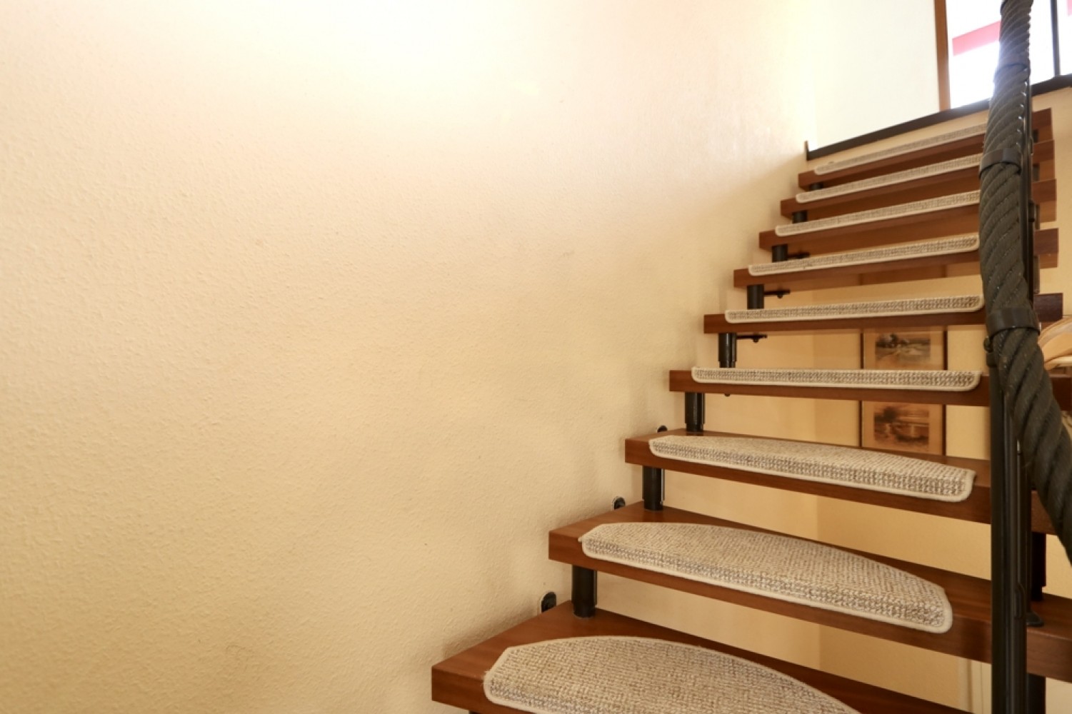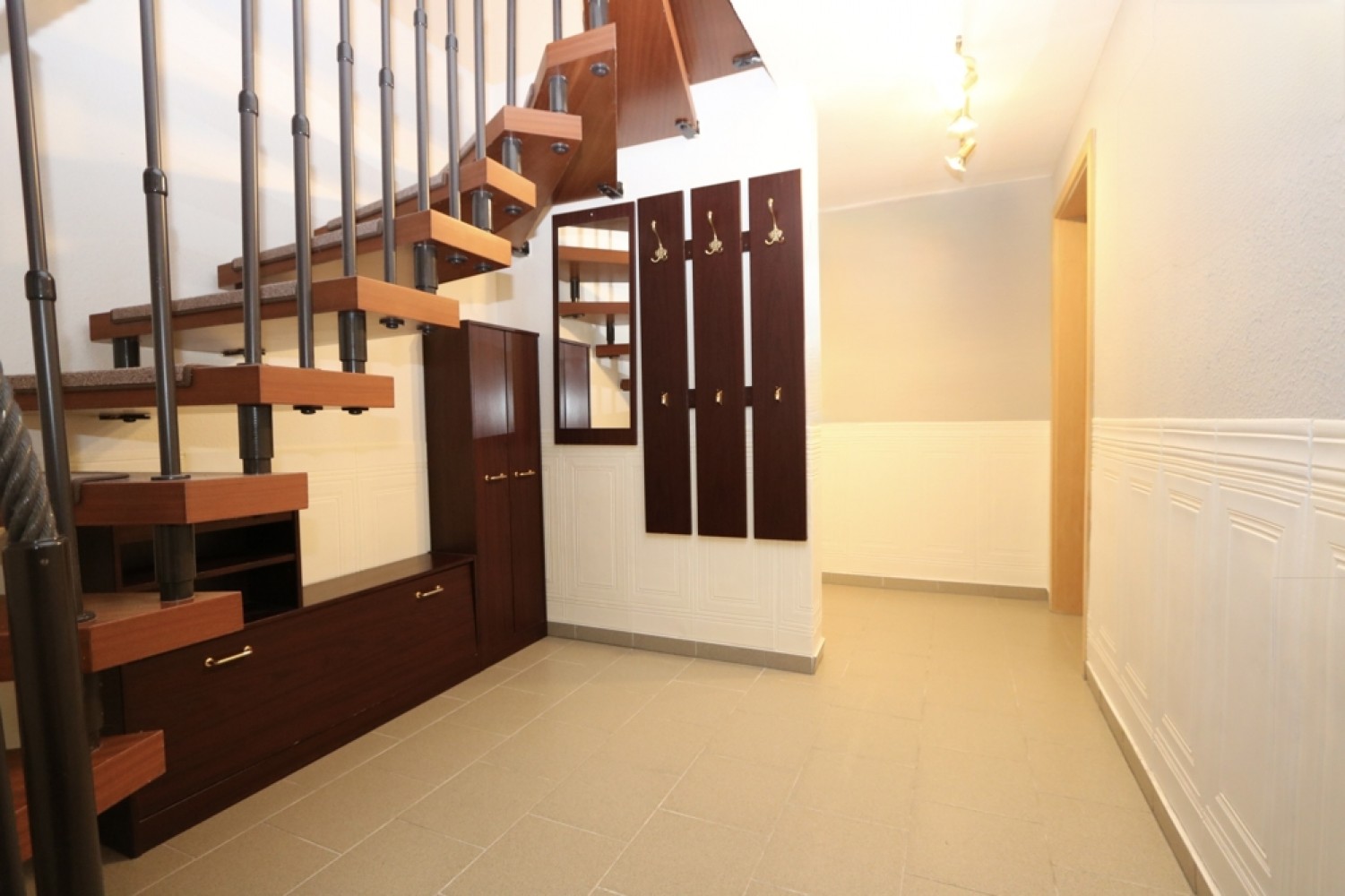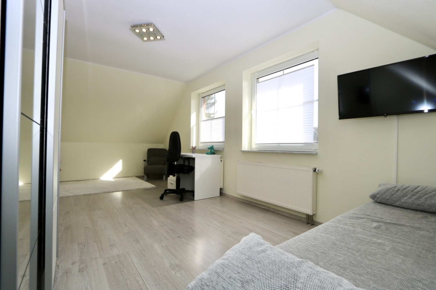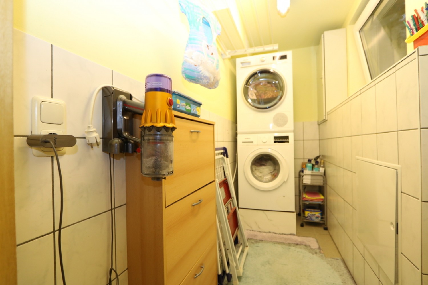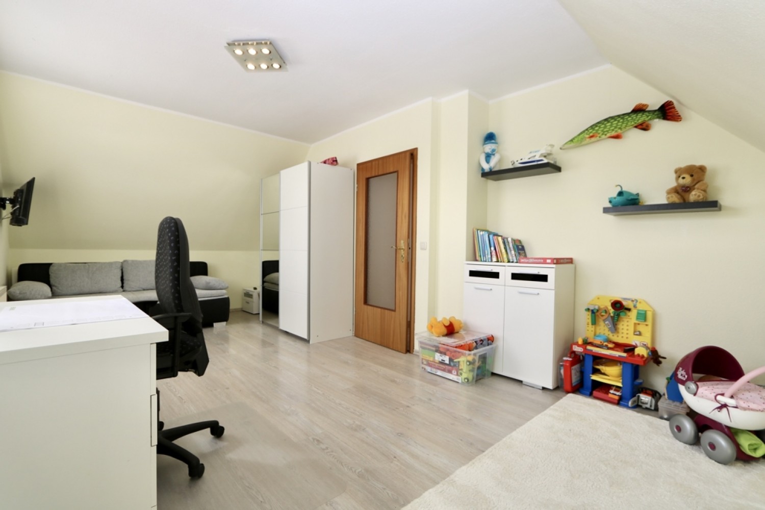 Die Bodenbeläge wurden funktional und wohnlich gewählt: Im Erdgeschoss sind überwiegend Fliesen verlegt, während im Dachgeschoss Teppich- und Laminatböden für eine gemütliche Atmosphäre sorgen.
