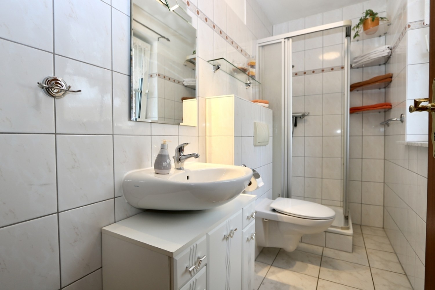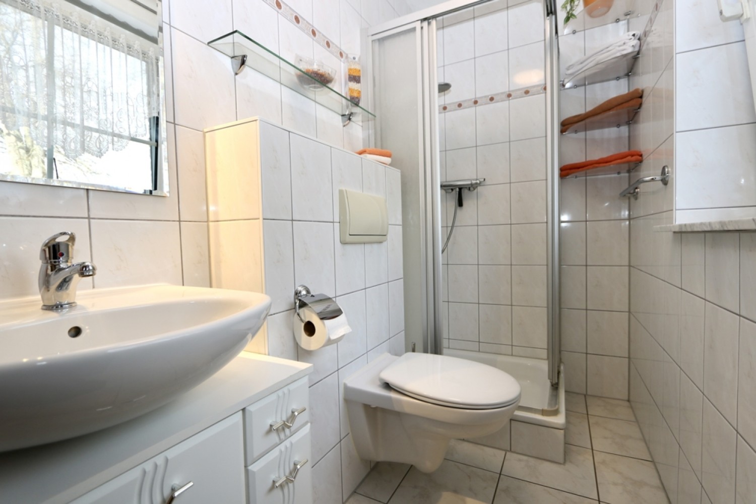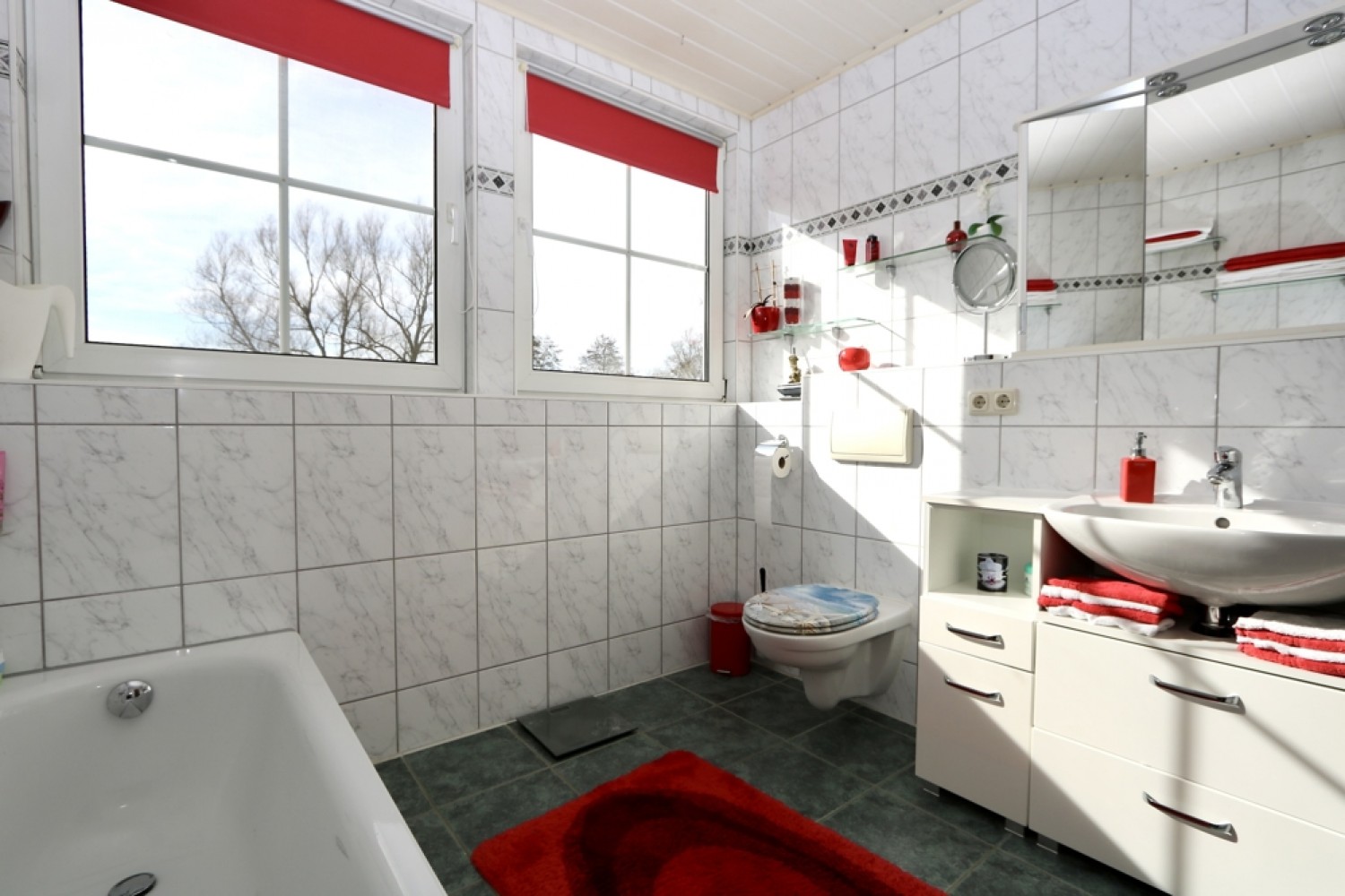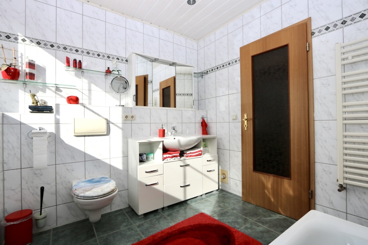 Auch das Badezimmer im Dachgeschoss ist über den Rücklauf in das Heizsystem eingebunden und profitiert von angenehmer Fußbodenwärme.