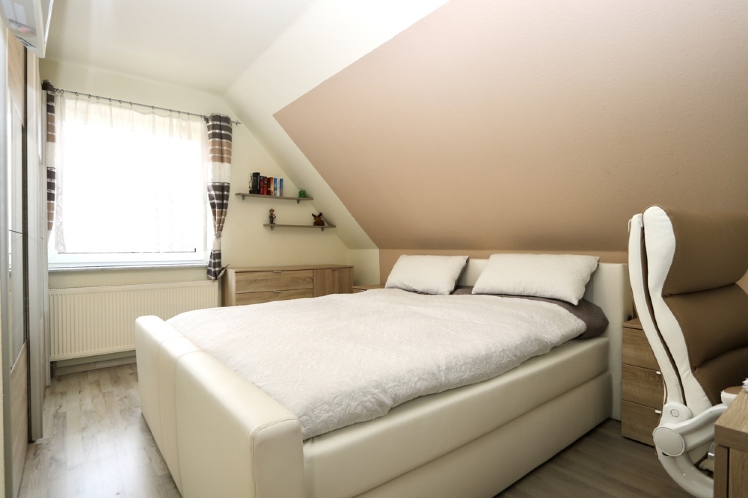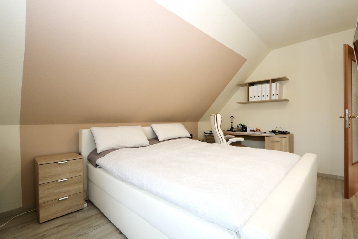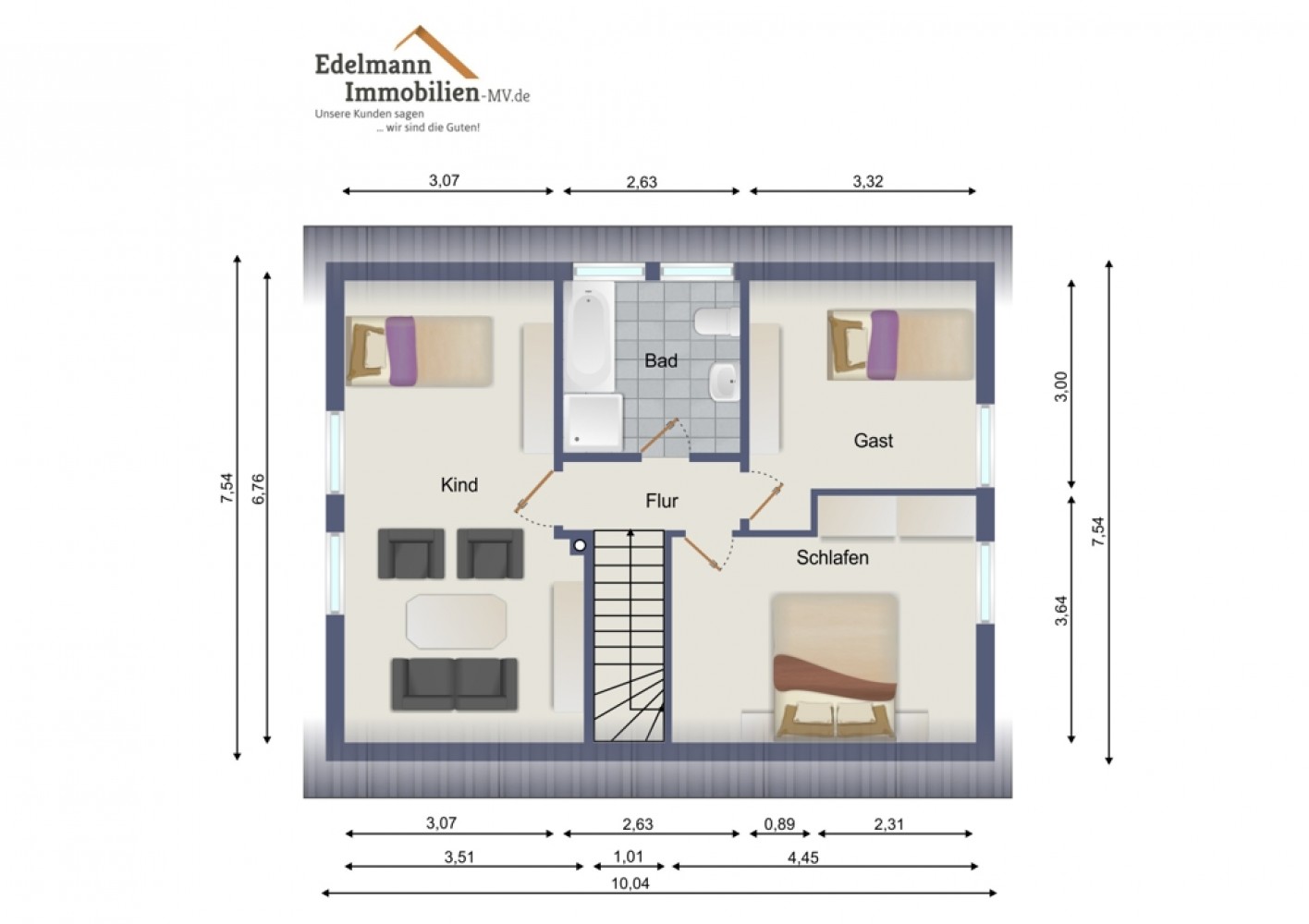 Im Dachgeschoss erwarten Sie drei vielseitig nutzbare Zimmer, die sich ideal als Schlaf-, Kinder-, Arbeits- oder Gästezimmer eignen. Ein Badezimmer mit Badewanne sorgt hier für zusätzlichen Wohnkomfort.