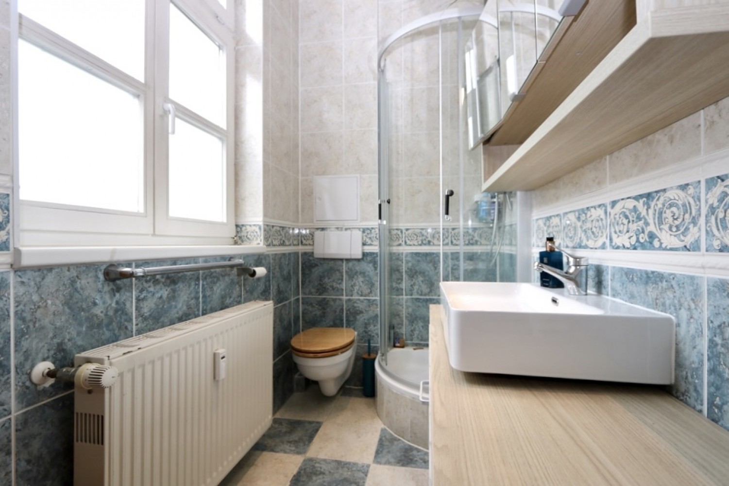 Die Gestaltung der Küchen- und Badezimmerbereiche erfolgte praktischerweise durch Fliesenverlegung, zum Teil deckenhoch.