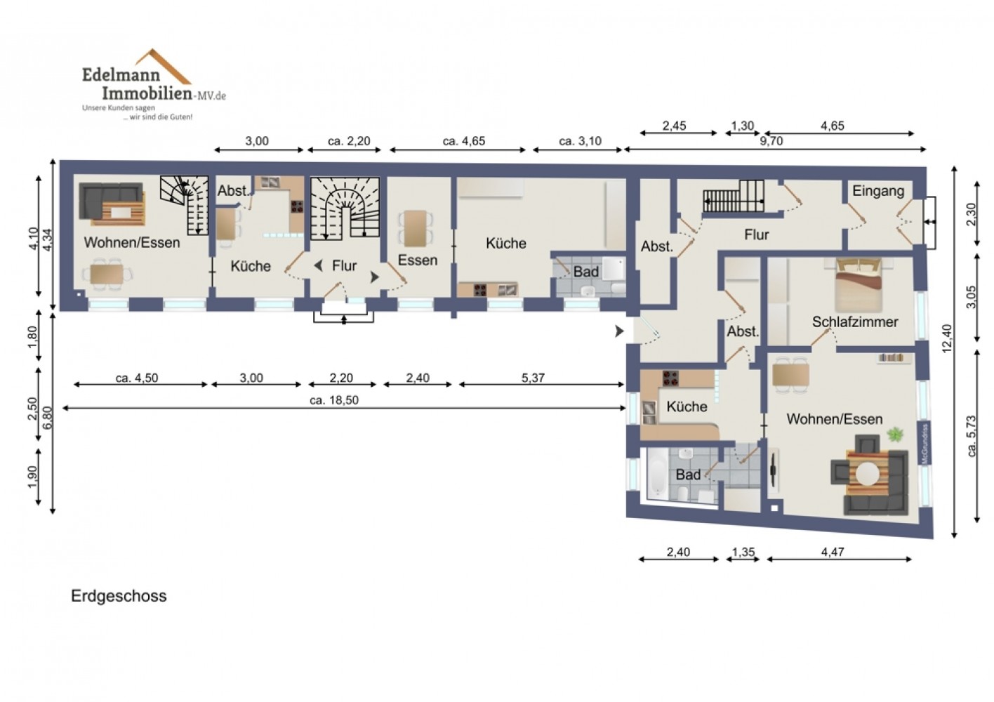 Eine 1-Raum im Erdgeschoss, eine Maisonettewohnung mit drei Zimmern (EG & OG) und eine 2-Raum Wohnung im Dachgeschoss. Eine weitere 1-Raumwohnung ist vorhanden, allerdings ist der Wohnungseingang über das Vorderhaus gegeben.