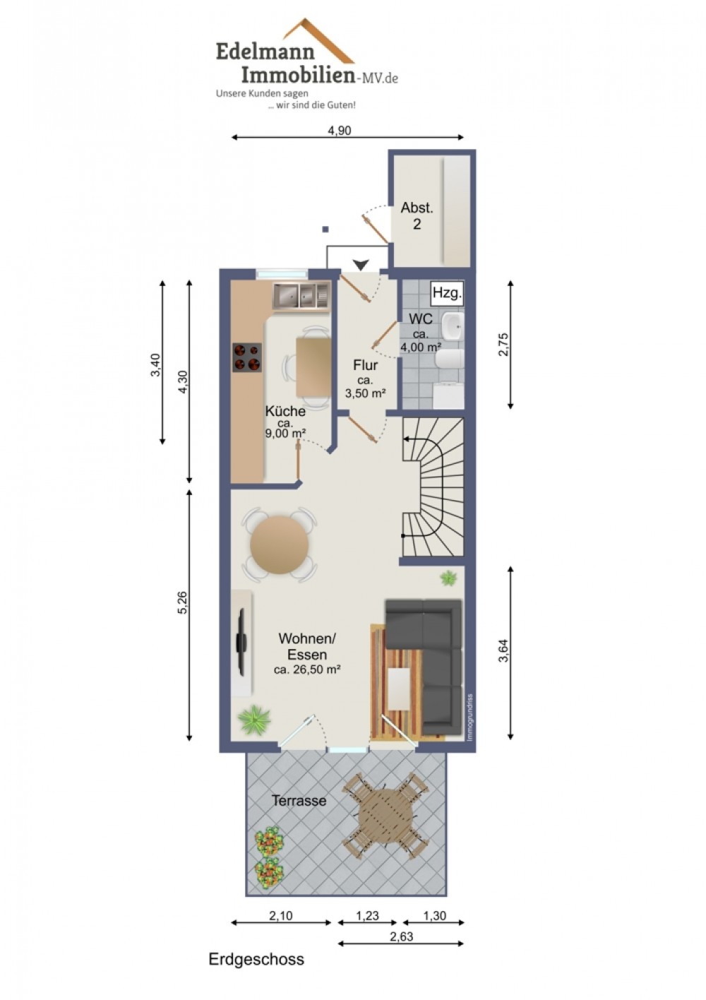 Ergänzt wird das Erdgeschoss durch einen funktionalen Flur als Windfang sowie ein praktisches Gäste-WC mit Waschmaschinenanschluss.