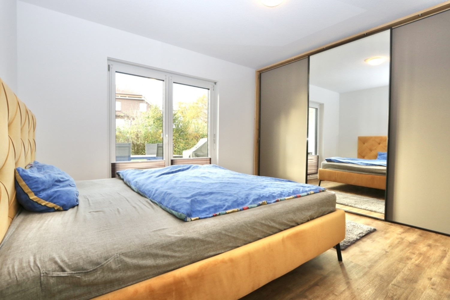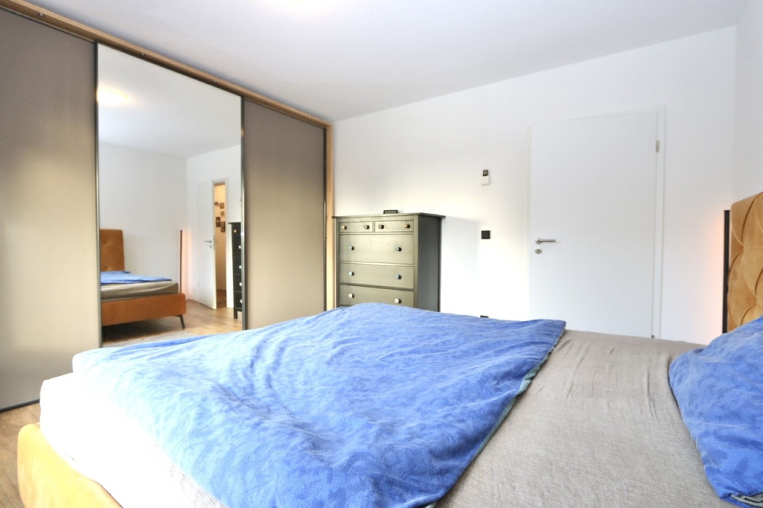 Das gemütliche Schlafzimmer bietet ausreichend Platz für einen großen Kleiderschrank und liegt direkt gegenüber dem modernen Tageslichtbad mit Badewanne und Dusche.