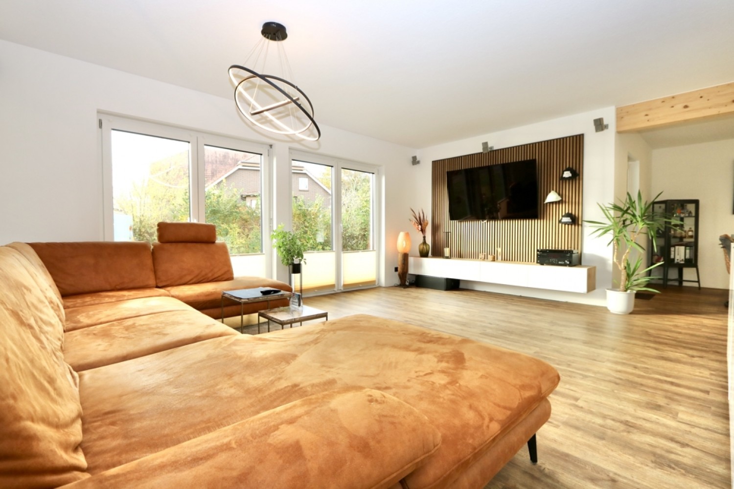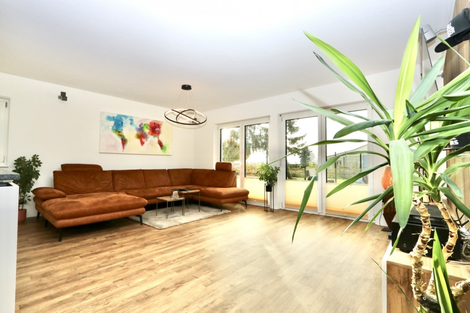 Die offene Gestaltung und die vier bodentiefen Fenster schaffen eine freundliche und einladende Atmosphäre mit viel Tageslicht.