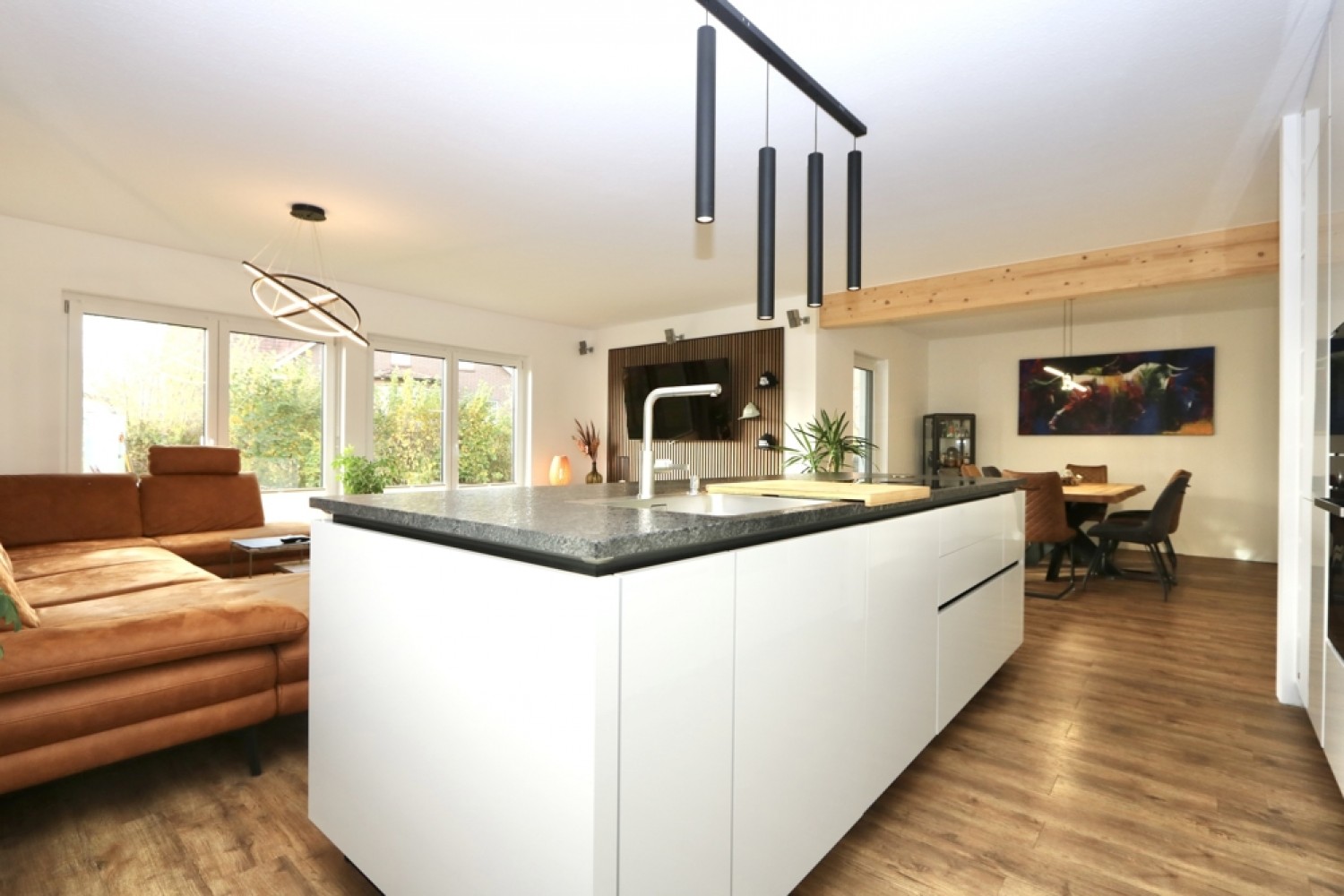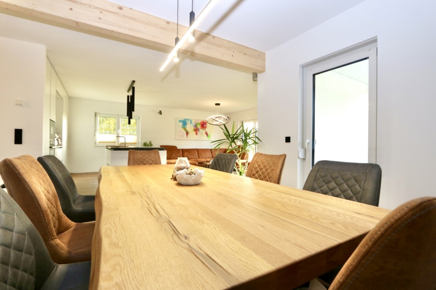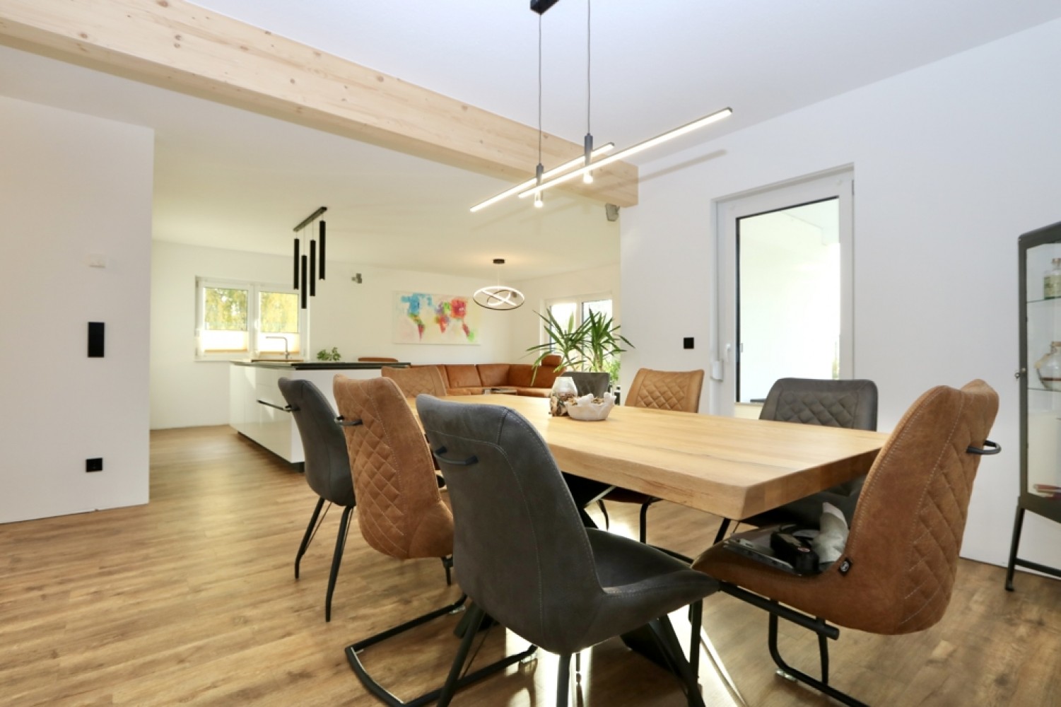 Der helle und weitläufige Wohnbereich mit gemütlichem Essbereich bildet das Herzstück des Hauses.