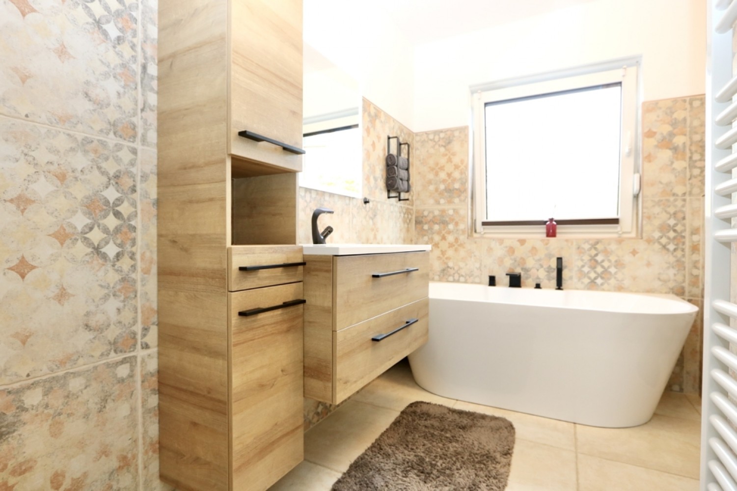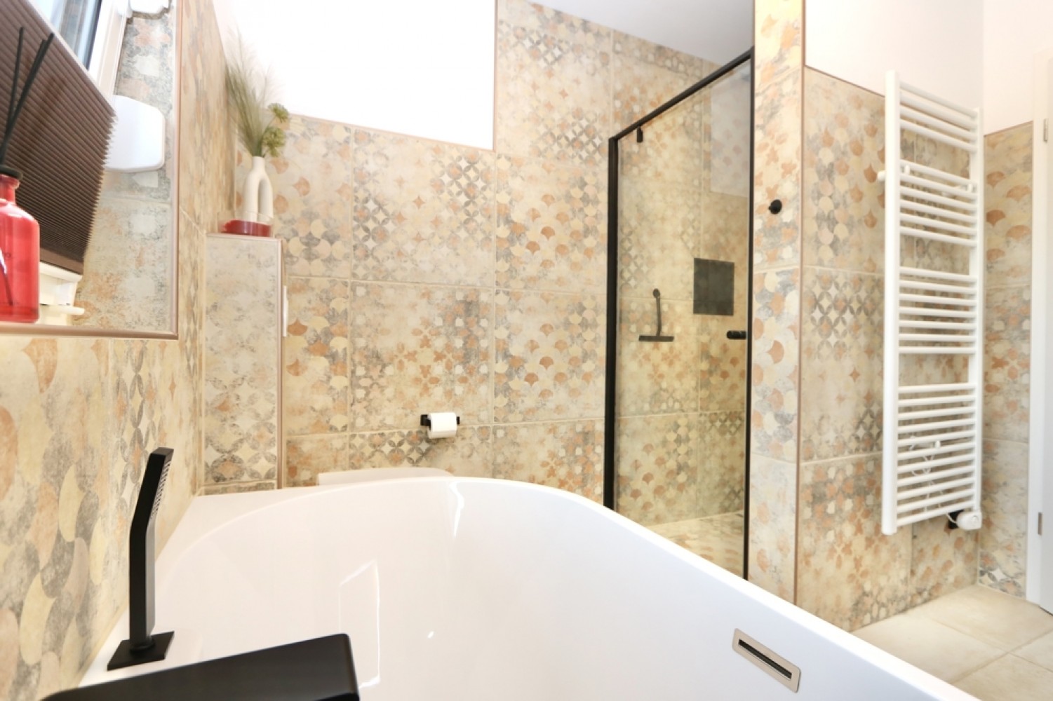 Das Tageslicht-Vollbad wurde mit hochwertigen Fliesen versehen und verfügt neben Badewanne und Dusche über eine praktische Handtuchheizung.